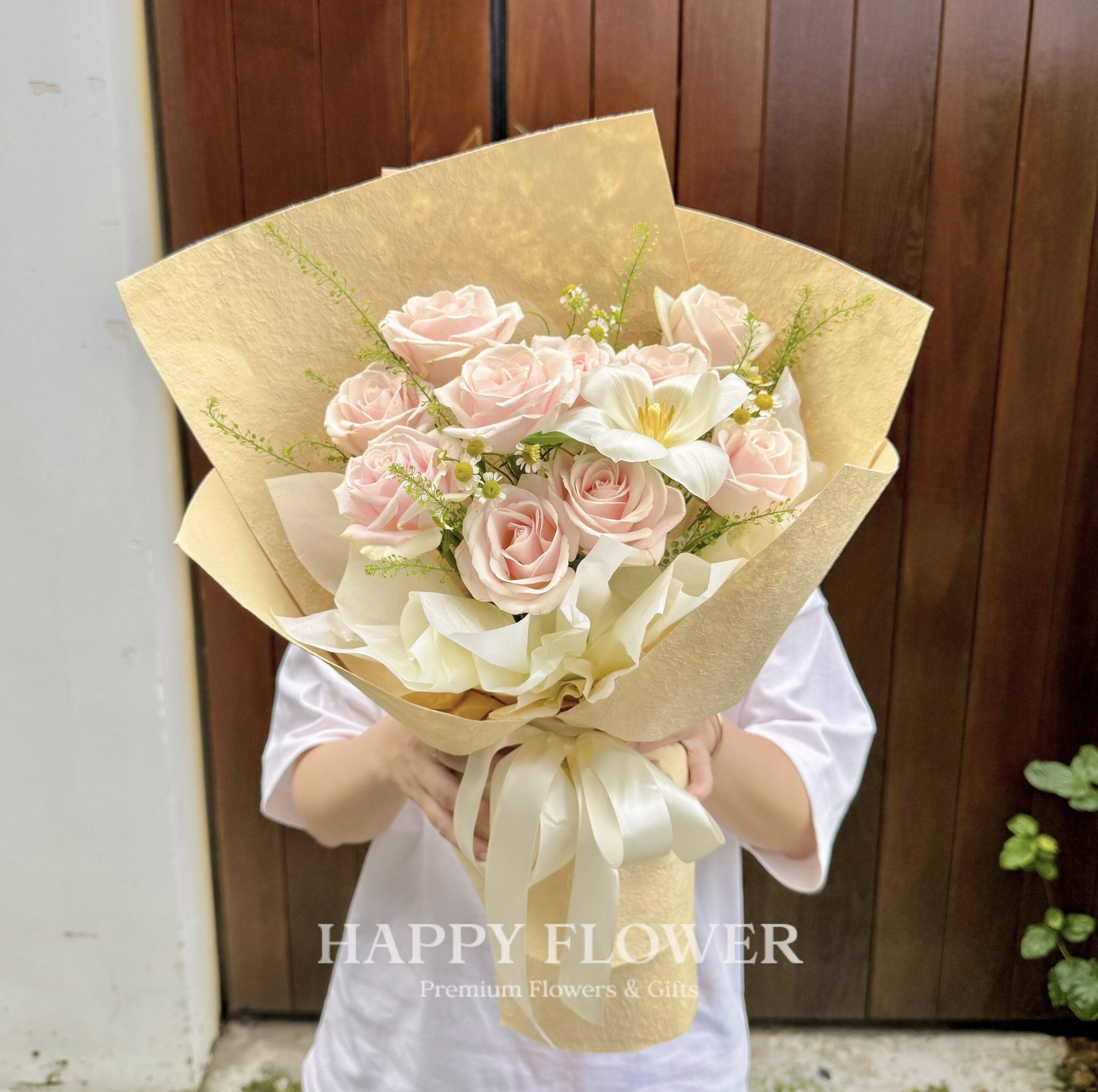 BÓ HOA HỒNG KEM MIX TULIP GIẤY VÀNG KEM