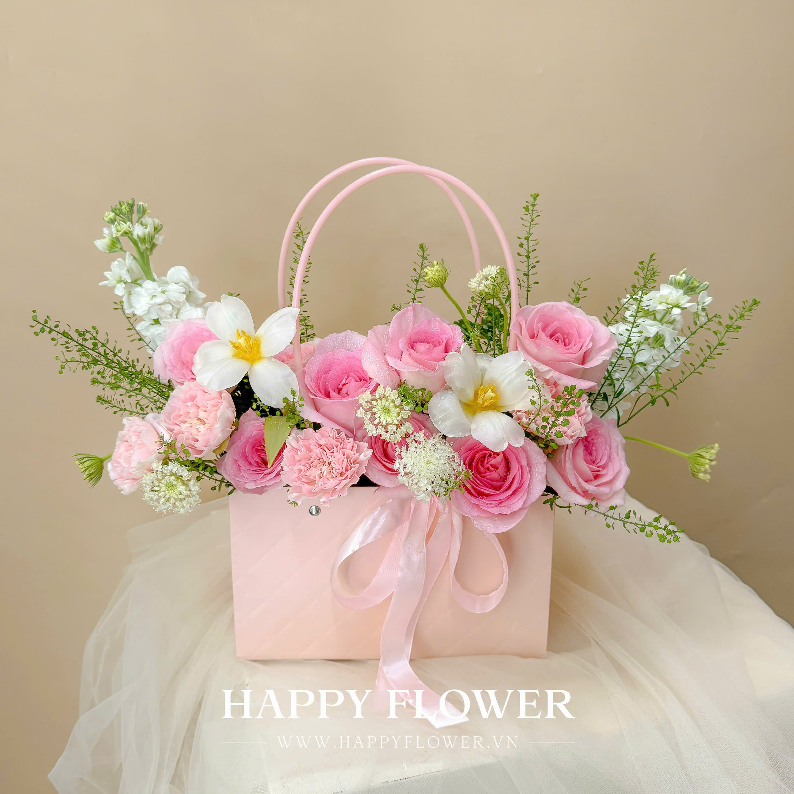 Giỏ hoa gồm hoa cẩm chướng, hoa hồng và tulip mix với hoa lá phụ theo ngày. Giỏ hoa sẽ là quà tặng thích hợp cho các dịp sinh nhật, chúc mừng khai trương. Kích thước giỏ hoa ngang ~28cm, cao ~28cm