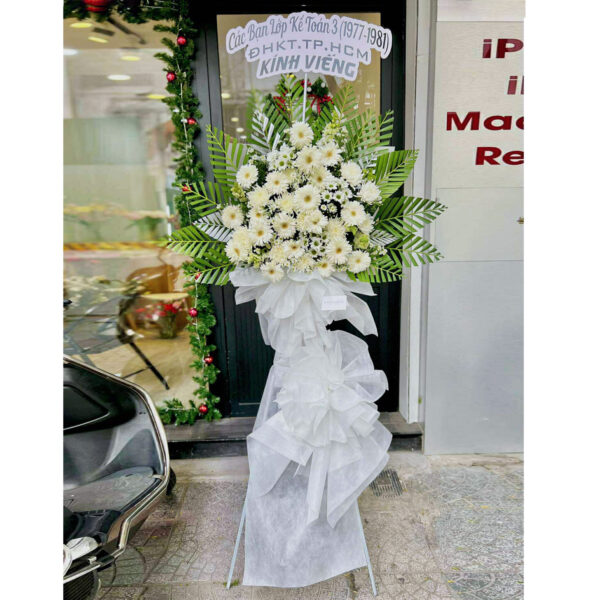 Kệ hoa chia buồn tone trắng, được kết từ hoa cúc và đồng tiền trắng, thay lời chia buồn chân thành và trang trọng.